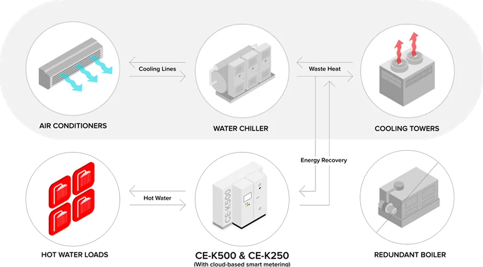 Our world-leading Captive Energy Heat Recovery Systems capture waste heat from AC chillers, district energy, geothermal, or ambient air, and utilize that energy to provide 100% of a building shot water needs; for domestic use, space heating, pools and hot tubs.